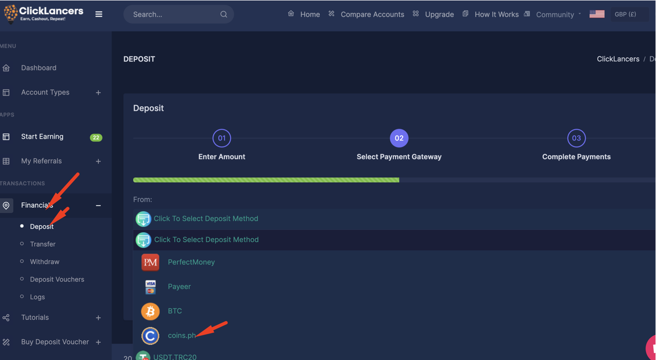 Once you make the payment, it will be credited to your deposit wallet on Clicklancers and you can proceed to upgrade your account.