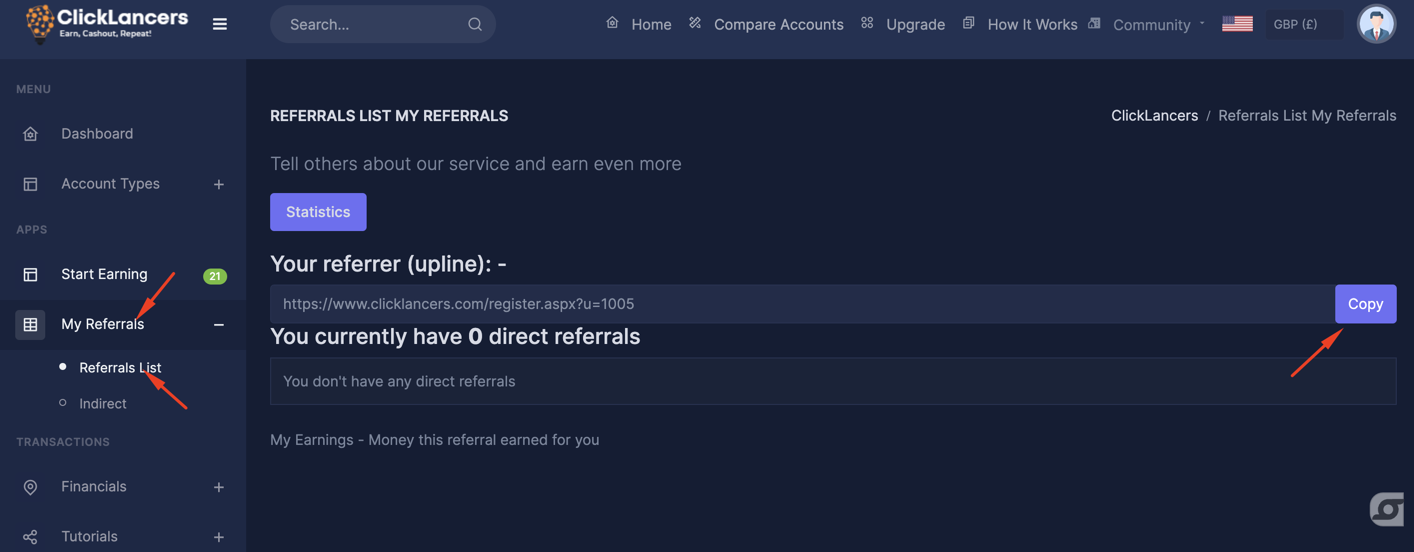 NB: When a referral watches a video ad you automatically earn. However, the referral must have a premium cashclicks account not a freelance account for you to earn from him/her.