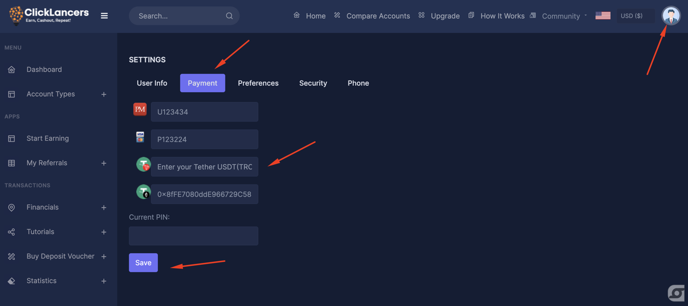 On your clicklancers account add the USDT address on your payment options page ON THIS LINK